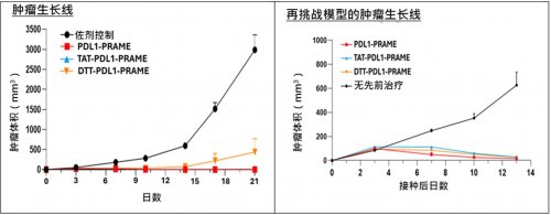 图2:同步针对PD-L1 及PRAME 疫苗在预防性肺癌小鼠模型中抑制肿瘤生长并有效防御肿瘤复发