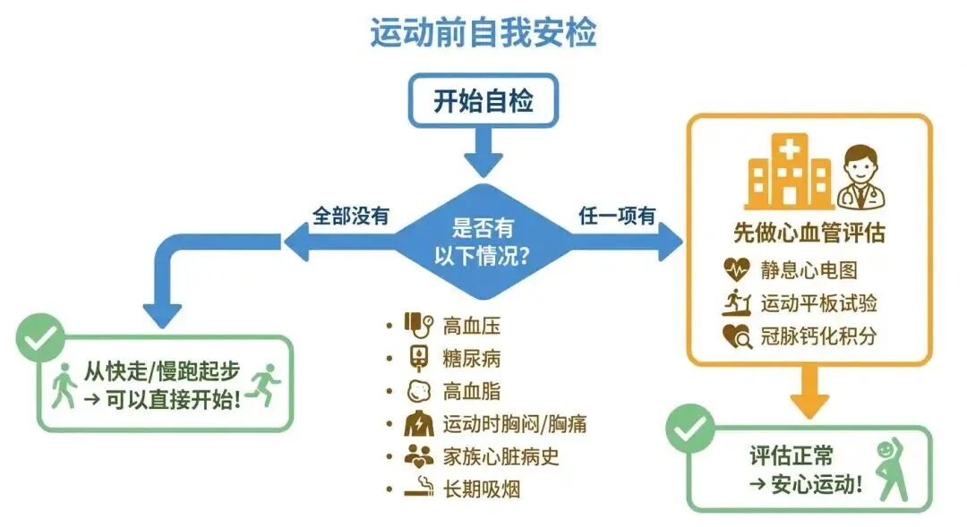 如果这些问题你全部回答"没有",而且你打算从中低强度运动开始(比如快走、慢跑、骑车),那基本上可以直接开始,不需要额外检查。