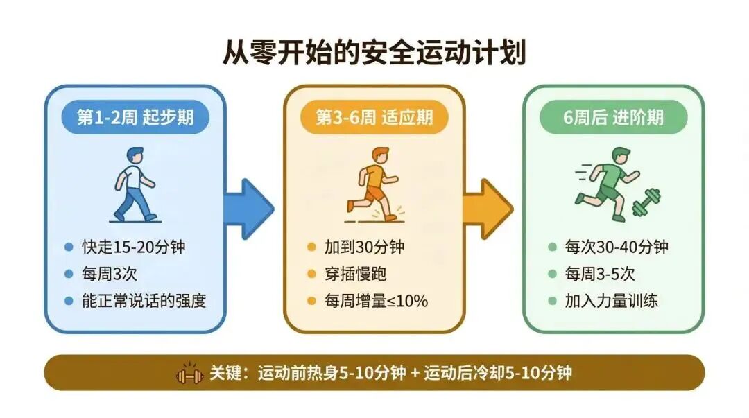 第1-2周 每次运动15-20分钟就够了,一周三次。强度控制在"能正常说话、稍微有点喘但不影响聊天"的程度。快走是最好的起步方式,别一上来就跑。