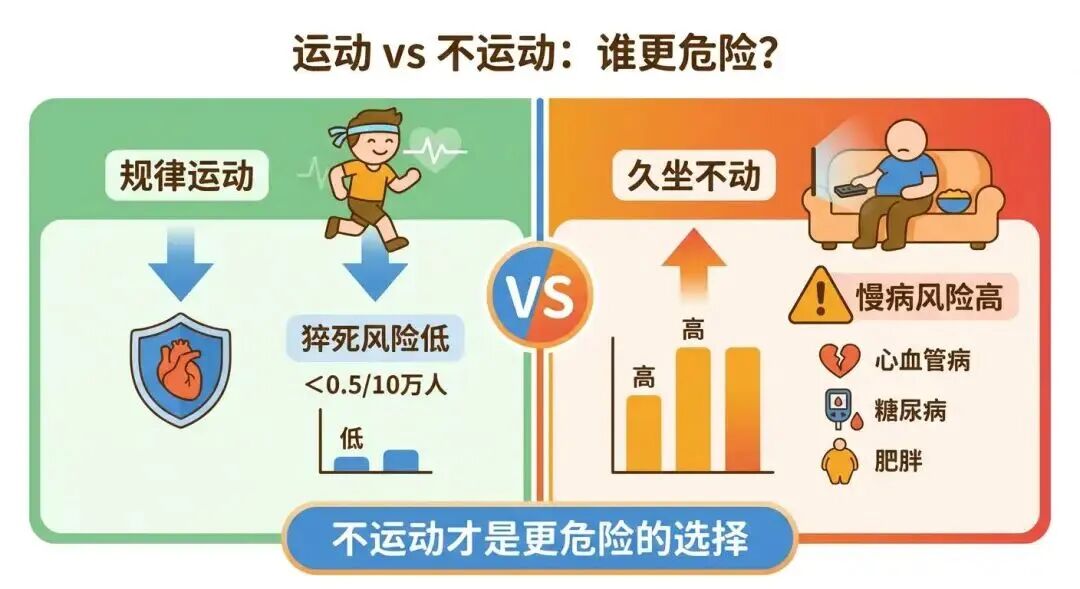 长期来看,较高身体活动水平与更低的猝死风险相关,也就是说,规律运动本身是在给心脏上保险,而不是增加风险。