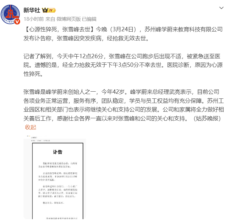 3月24日,考研名师张雪峰因突发心源性猝死,抢救无效逝世,年仅41岁。